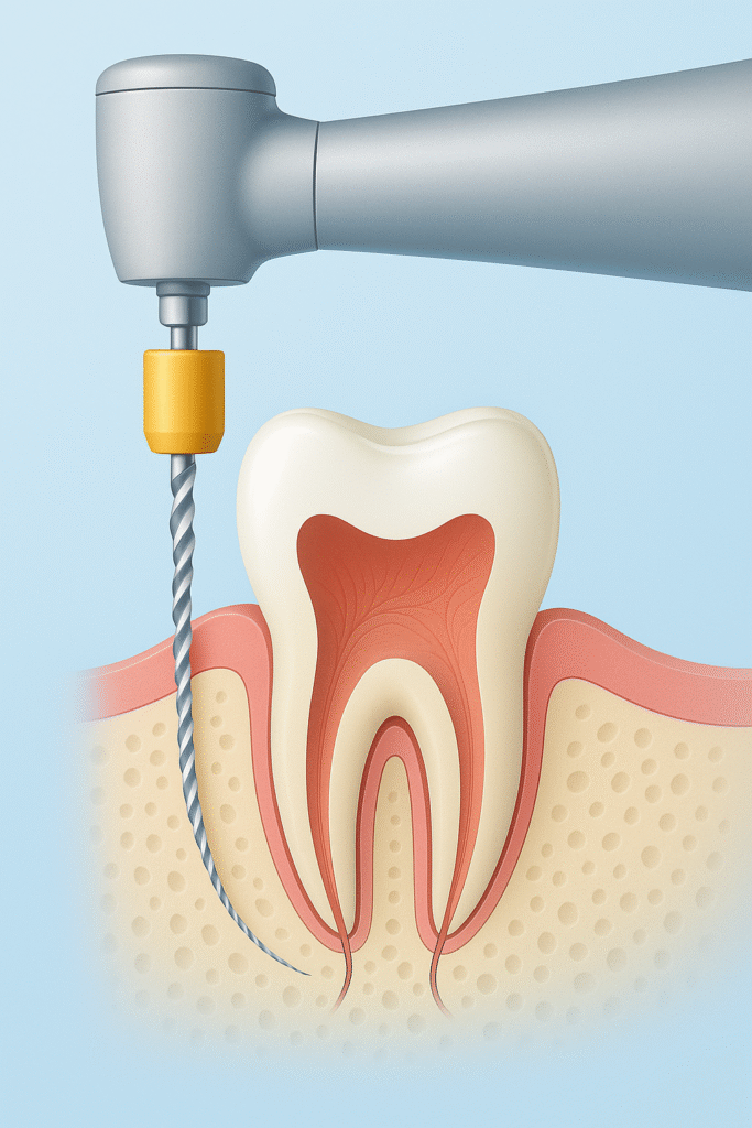 Bei einer Wurzelkanalbehandlung müssen entzündetes Gewebe und Bakterien vollständig aus den feinen Kanälen im Zahninneren entfernt werden. Dafür setzen wir moderne, maschinell betriebene Feilensysteme ein – hochflexibel, präzise und besonders effizient.